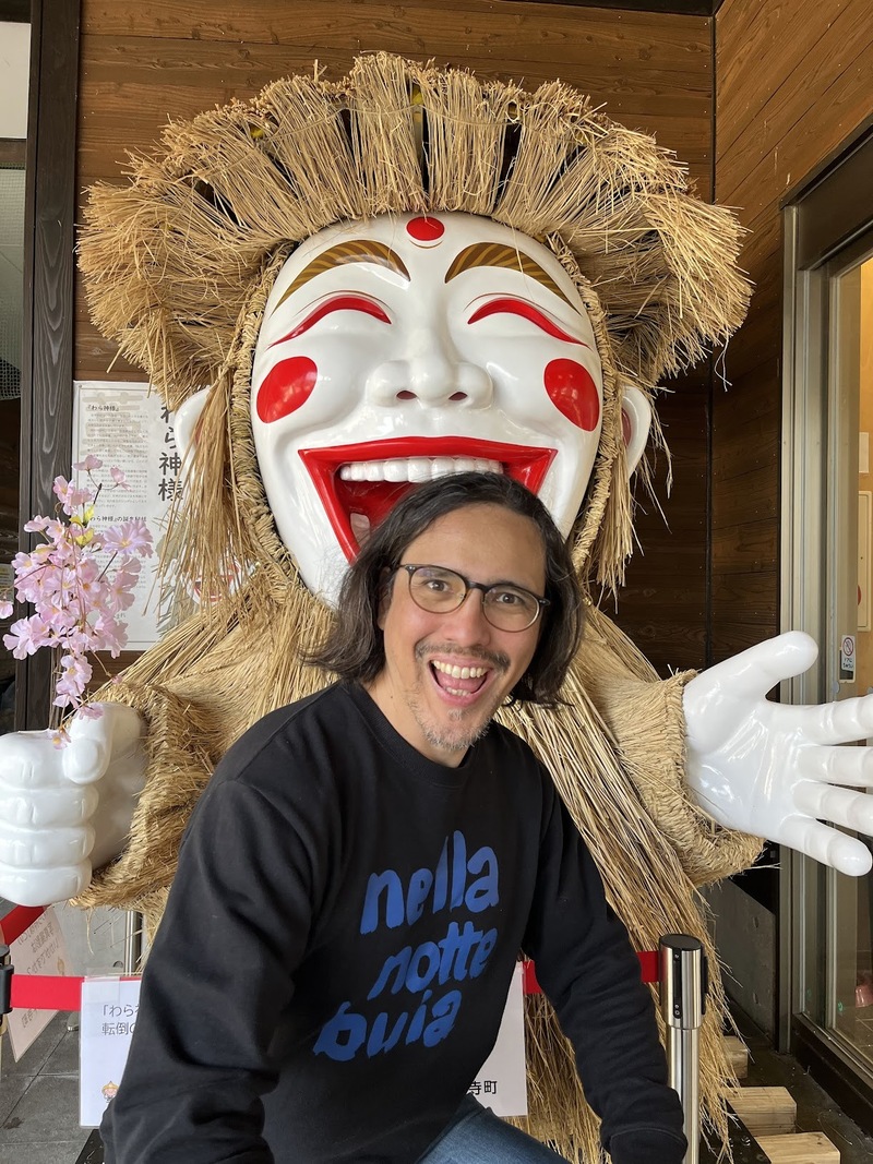 わら神さま。確かに満面の笑みだけど、きっと稲わらの「わら」とかけてあるんだろうな。どれどれ? 地域特産のブランド米「いちほまれ」の稲わらを身にまとった、高さ約2メートルのモニュメント… あれ、この神様、もしかして、若いの?