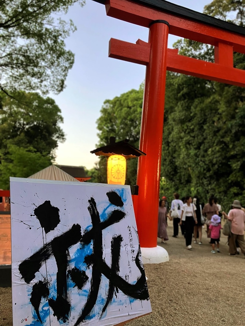 ということで、行ってきました。夏気分がすごかったですよ。いつも静かな糺の森に出店がわんさと並び、まっすぐ歩くのも大変なくらい。そして、ようやく辿りついた鳥居の前には、こんな見事な書が。そうだ! いろいろ良からぬものは祓っていこうぞ!