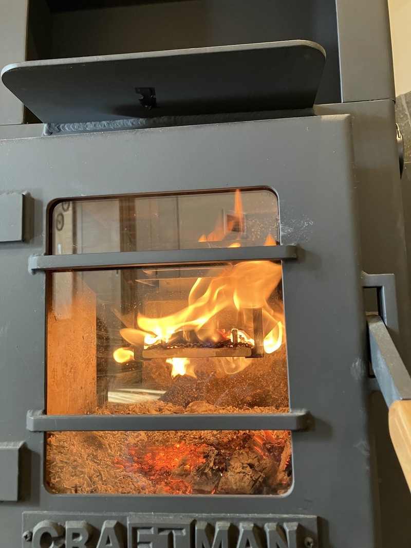 なんですが、サイズはわりと小さめなんで、見合った薪をわりと頻繁に放り込む必要があるし、火加減を調節するのも慣れないうちは四苦八苦。さらにそこでと、今年秋に買い込んだのが、ペレットという木をギュギュッと圧縮して扱いやすくしたもの。一見ペットフードみたいに見えるようなひとつひとつは小さい燃料を、このストーブの上からドサドサ入れておけば、燃えるほどにちびちび落ちてくるので、火の調整が格段に楽になるんです。