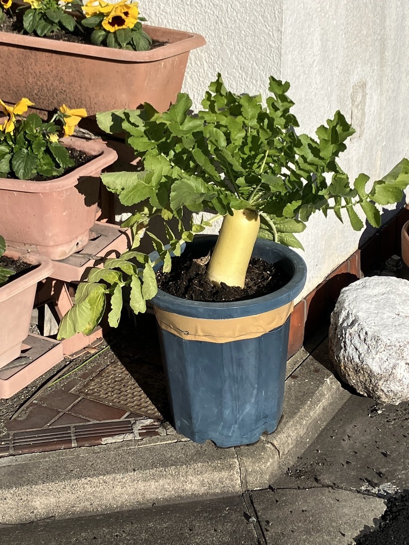 そうなんです。わりとご近所のこちらのお宅、前を通りかかると、僕の知る限り少なくともここ数年、植木鉢に大根がぶっ刺してあるんです。いや、大根がニョキニョキ育ってこうなったんでしょうね。