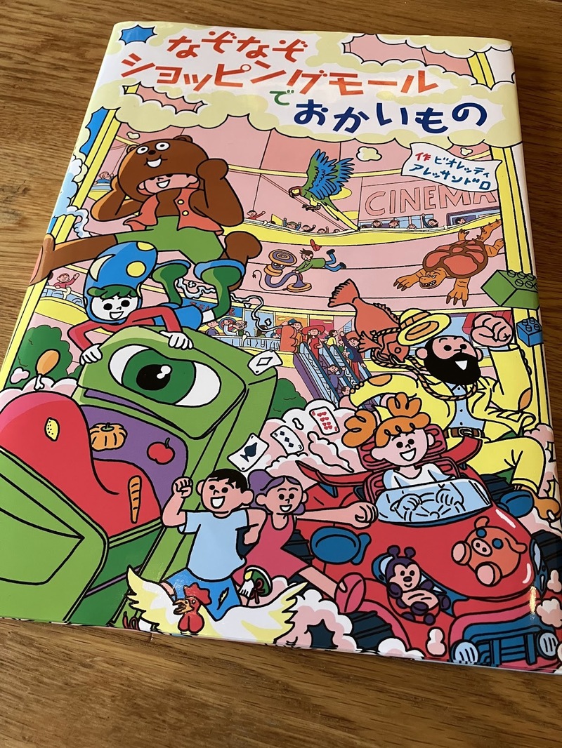 これは、ショッピングモールを舞台にしたもので、フロアごとに違った商品が並んでいて、そこかしこになぞなぞが合計60ほどしかけられているので、ページをめくっては細かく描きこまれたキャラクターや商品を眺めながら、なぞなぞをランダムに解いていくという仕掛けです。
