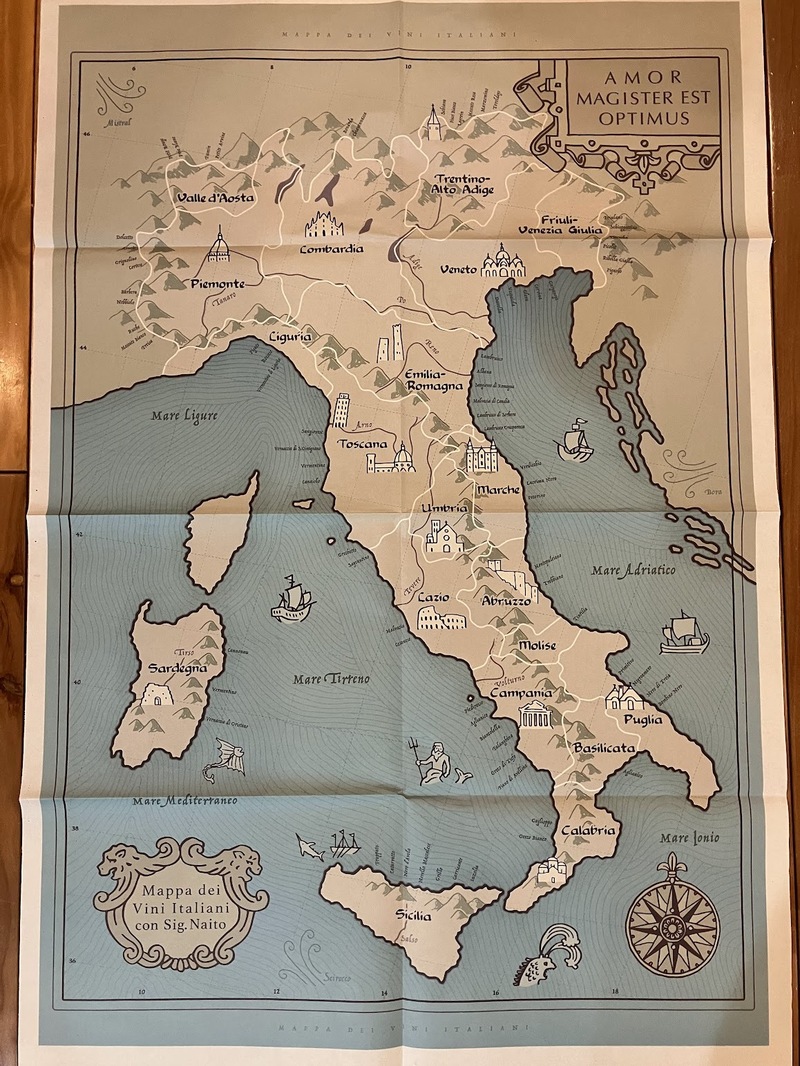 これ、イタリアのワインを作る葡萄の品種の名前が記載された地図なんです。イタリアって、日本と同様、北から南まで長く、海に囲まれていて、山岳地帯もたくさん。てことは、葡萄の品種もその土地や気候によって珍しい土着品種もたくさんあるってことなんです。