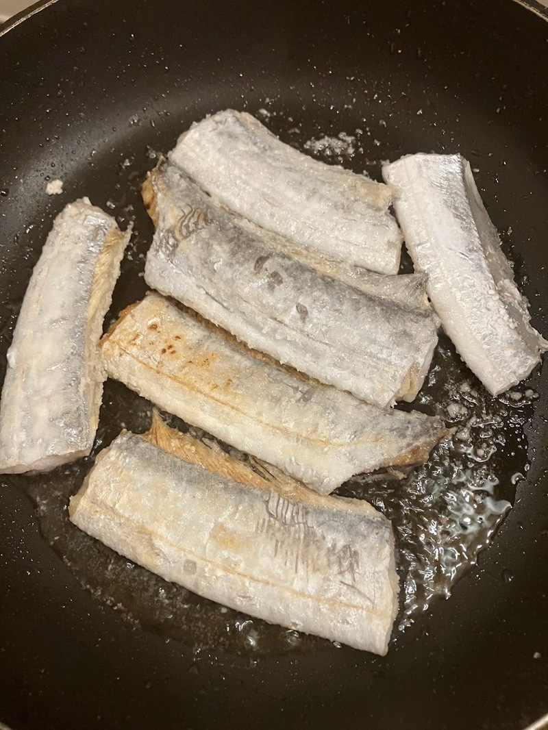釣りに行ったらたくさんとれたのでおすそ分けということでしたが、まあ立派なのを何匹もいただきました。今、ちょうど旬なんですね。刺し身にしたり、塩焼きにしたりと、どれもおいしいんですが、こんな風に小麦粉や片栗粉をはたいてカリッと焼くのも最高です。