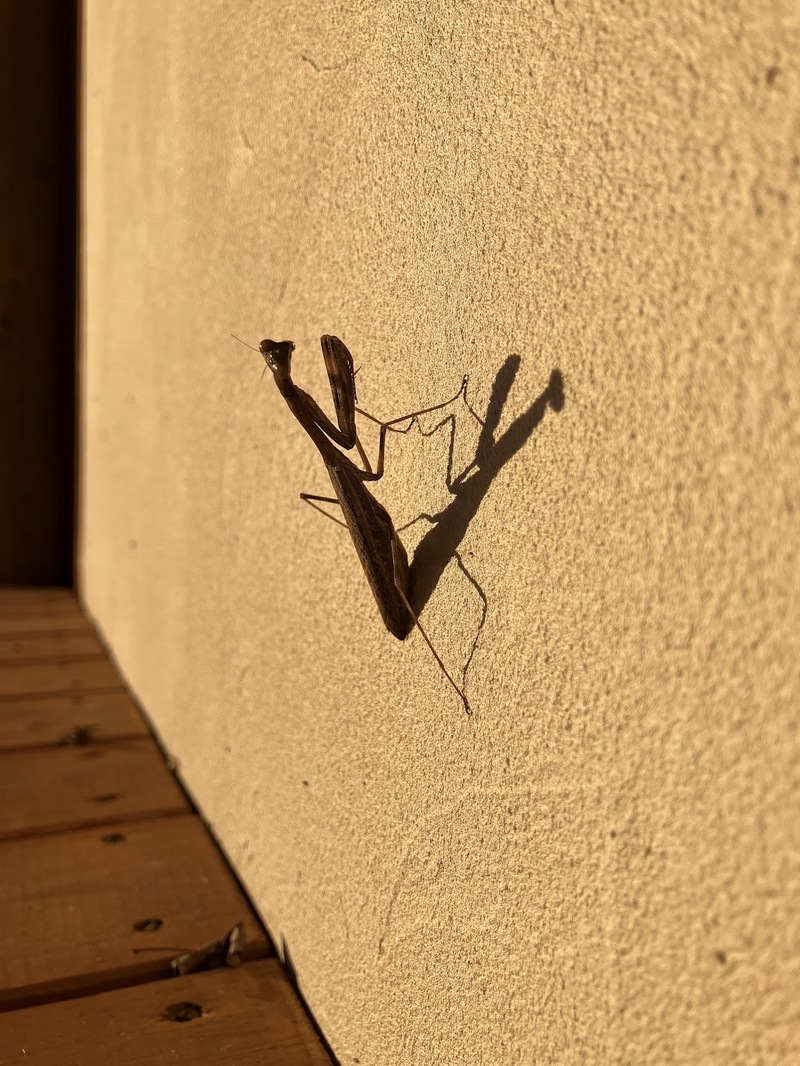 カマキリです。壁に取りついて、そのまま微動だにしないカマキリです。生きているのか、死んでいるのか、それすら定かでない。結構近づいて撮影しましたが、それでも動じません。弱っているのか、ただ物思いに耽っているのか、わかりません。