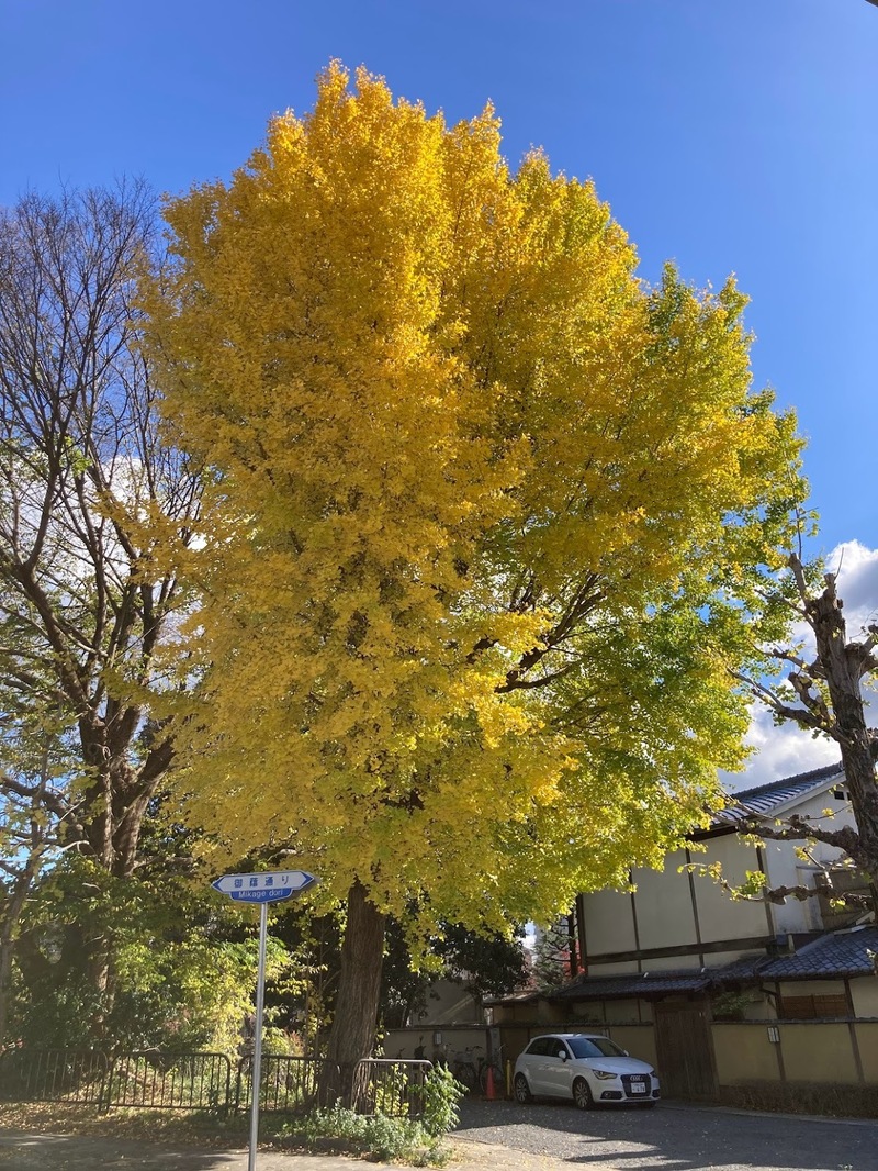 信号待ちで止めたペダルから足をおろし、赤が青に変わるのを待っていたら、その脇には黄色が。信号なら当たり前ですが、その黄は信号機の外。そう、このイチョウの木。
