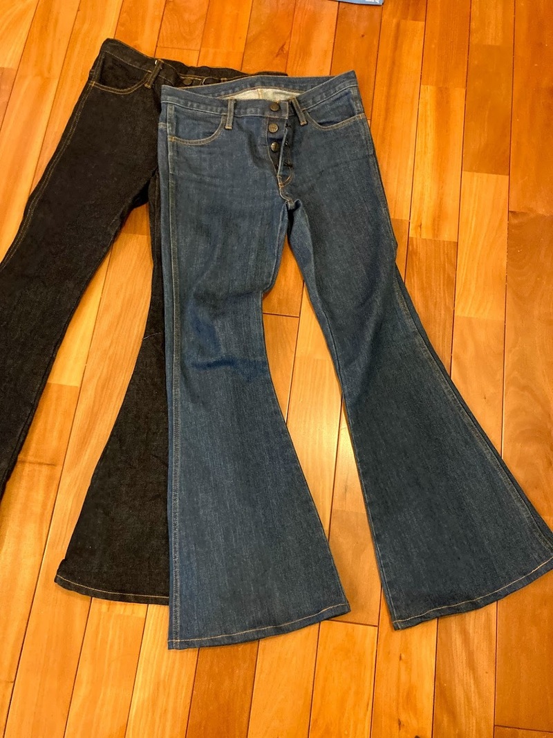 僕はと言えば、人知れず、おニューのベルボトムをおろしておりました。僕がいつも調達している職人さんのお店は、こだわりがとにかく強くて、ブルーのジーンズはどれもが濃ゆい濃ゆいインディゴ。ノンウォッシュなんです。ダメージ・ジーンズとか、おっちゃんが毛嫌いしているんです。