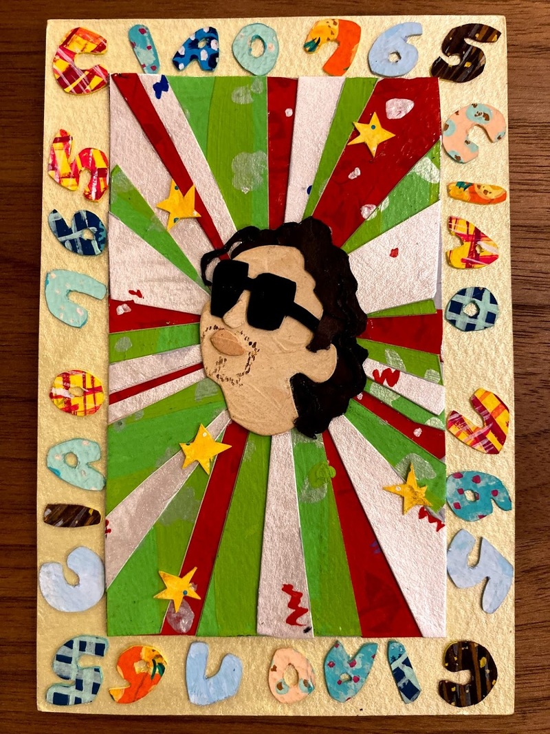 で、そのあさひくんには、お兄ちゃんがいるようで、こちらは「ひなせくん」。彼も絵葉書を送ってくれたんです。その力作がこの画像。すごくないですか? 切り絵のようにして、ペタペタ紙をたくさん貼ってくれているから、凹凸があって、なんならちょっとした3Dですよ。しかも、全体の構成力もすばらしいでしょ? いいぞ、ひなせにあさひのご兄弟! ありがとう! 骨折おじさん、すごく嬉しい!