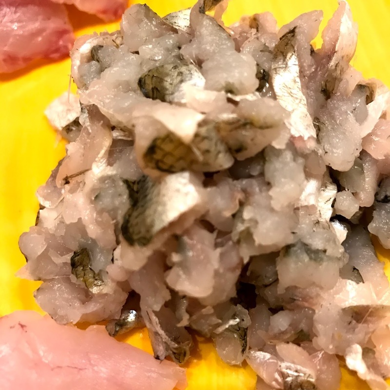 次から次へと頭と内蔵を取って、ぎこちない手付きで3枚におろして… でも、はすって小骨が多いんだけど、どうするんだろう? もう一度スマホをチェックすると、なんと最後はハサミでジョキジョキ切るんだとか。