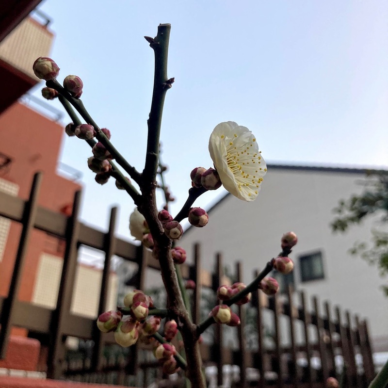 おもろいなぁ。こういうことがあるから、散歩はやめられへんねんなと、歩きながらふと目をやると、梅が一輪、見事に咲いてました。日曜日の夕方は、三度、口角の上がる時間でしたよ。