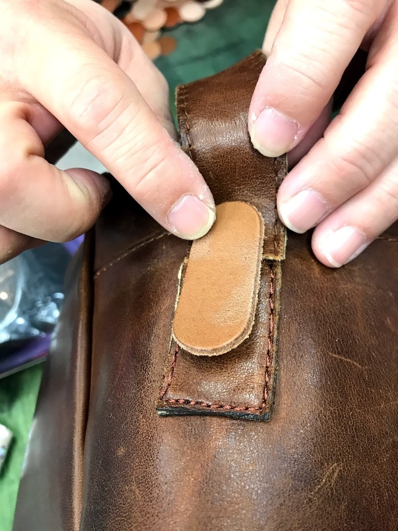 近所の革職人さんのお店に相談を持ちかけると、「革の寿命ですね」とすげなく言われてしまいました。やっぱりダメか。と思ったら、「ここに新しい革を当てて縫い直してみましょう」と粋なご提案。