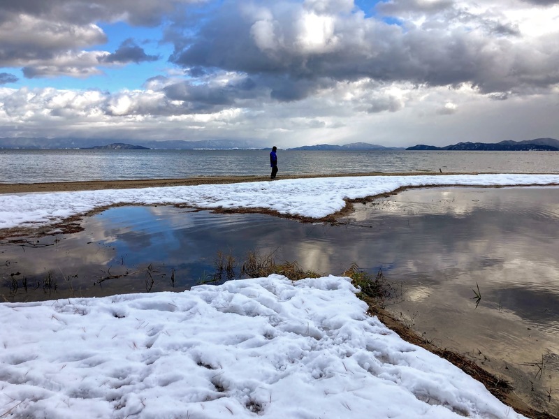 長靴履いて、ちょっくら琵琶湖まで。夏には投網にSUPにカヤックにと楽しんだ浜辺もすっかり雪化粧。雪雲はみるみる姿を変えながら猛スピードで上空を行き来し、対岸には蜃気楼も浮かぶ、なかなかドラマティックな光景の一部となりました。
