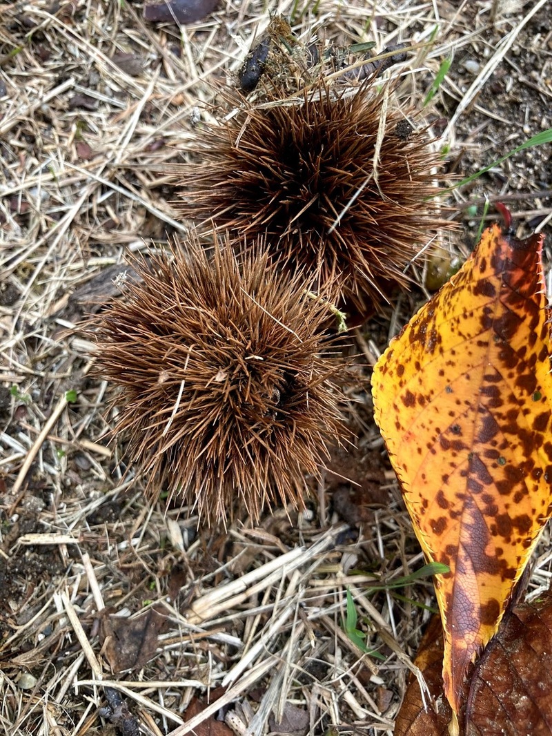 でもね、いくらあたりを見回しても、栗の木なんてないんです。じゃあ、どうしてここに? 鳥かな? 誰かの忘れ物かな? 触って確かめたわけじゃないけど、もしかすると「うに」の可能性も… それはないか。今季はまだ食べていない栗のスイーツでもいただきながら考えたい問題です。