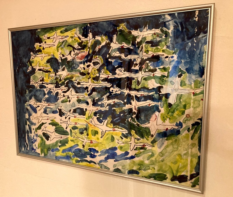 そんな僕も、周りの目を気にせず、思うままに水彩画を描いていたことがあるようです。小学校1年生の頃かな。それが、このおびただしい鶴の絵。自分では当時気に入っていなかったようですが、祖母が額装して飾ってくれていました。彼女が亡くなった時に、遺品として引き取って飾っていたんですが、このほど額が壊れたので、改めて新しいのに入れて飾り直しました。いつかまた、ゆっくり絵を描くこと、あるかなぁ…… なさそう。
