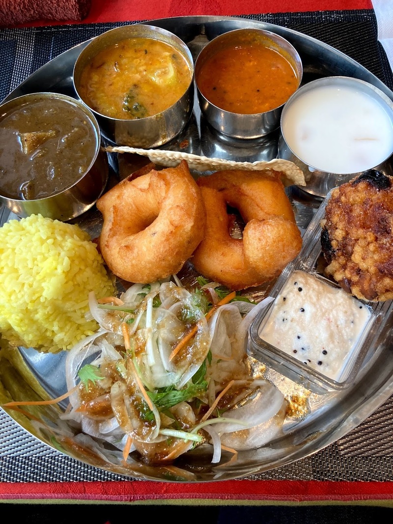 とまぁ、それはともかく、食べるのが専門というわりには、まだまだ知らないことがありました。一昨日、京都でランチにと初めて入ったインド料理店。メニューを見ると、南インドランチというものが。それ、いってみよう! 出てくると、プレートの真ん中には、ドーナッツが…