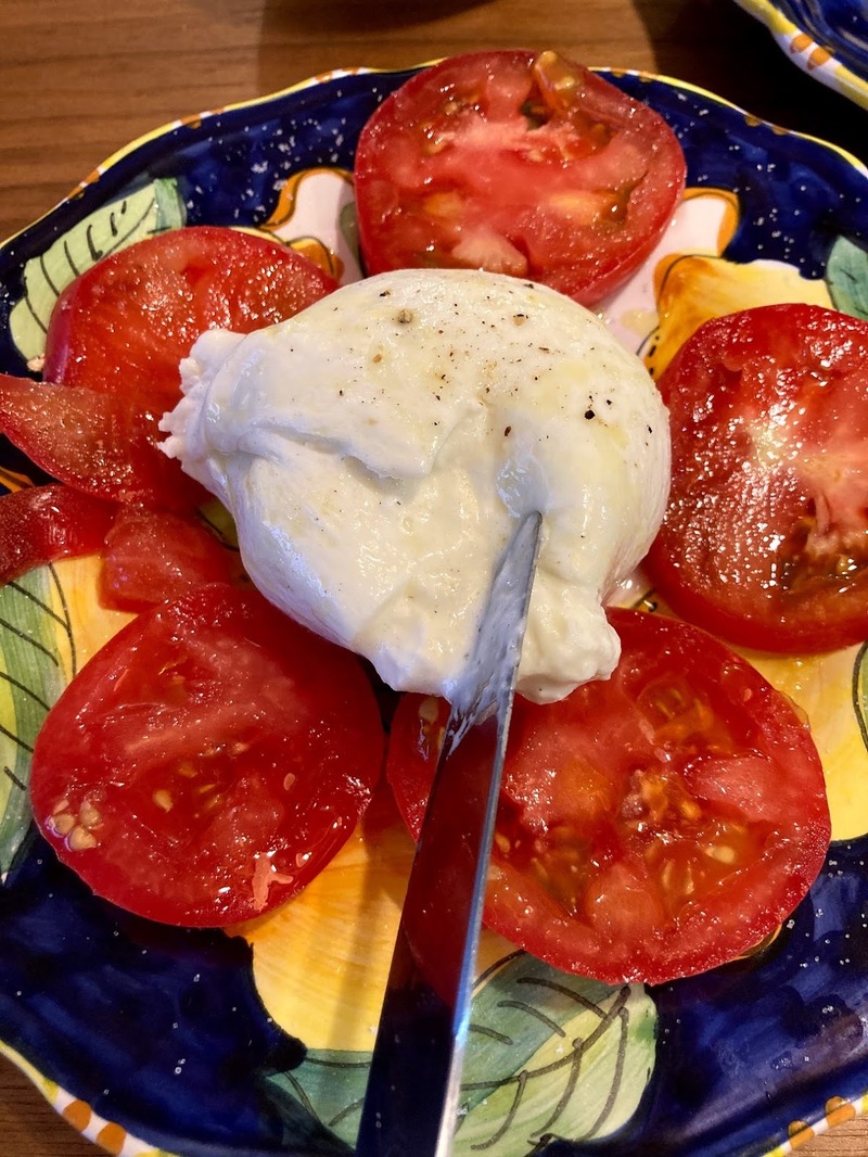そう、もう何も要らないって思えるんですよ。食卓にブッラータがこうしてデンと鎮座していれば。モッツァレッラだけでも、こうしてスライスしたトマトと合わせれば最高だっていうのに、それがランクアップしてブッラータになった日には、もう何も要りません。