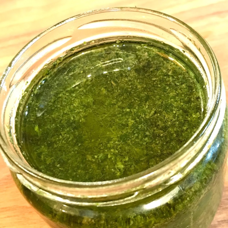 先週このダイアリーで披露した、手作りの大葉ペースト。粉チーズと松の実やくるみなど、ナッツを入れて、オリーブオイルで蓋をするようにしながら瓶詰め。面倒なようですが、フードプロセッサーさえあれば、実はかなり手軽に作ることができる上、その後はパスタと和えるだけで、れっきとした一皿が簡単にできあがるので重宝するんです。