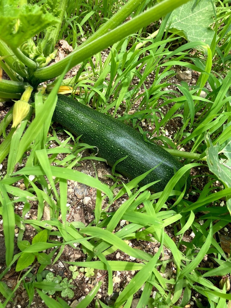 先週末、そんなドーナッツ農園を覗いてみると、ぼーぼー生えた雑草に紛れて、なんとなんと、ズッキーニが一本だけ、まるまると成長しているではありませんか!