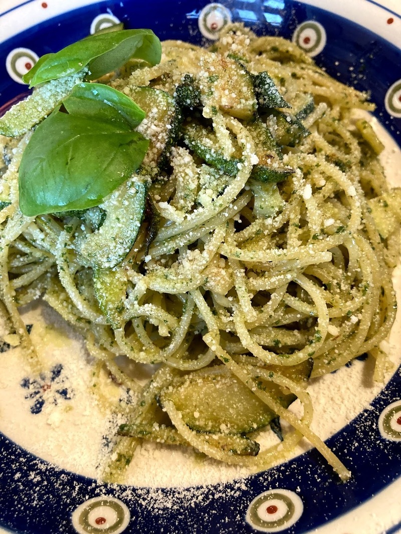 週末、早速使いましたよ。ソテーしたズッキーニを入れつつ、最後にはバジリコの葉っぱを添えました。もりもり、あっという間に食べられます。