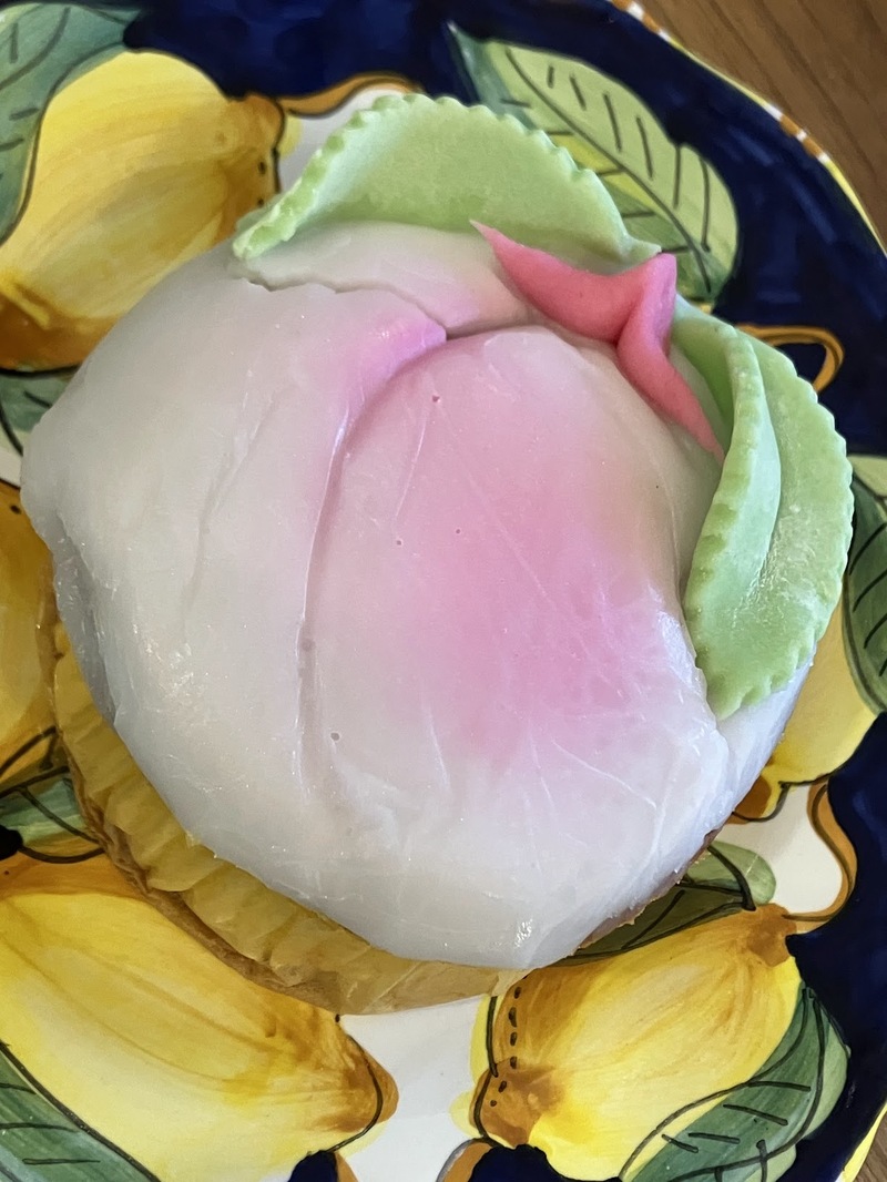 かわいいでしょ? 桃の節句に供されるものと聞いていますが、春の風物詩って感じで3月4月はいろんなお菓子屋さんでショーウィンドウに並ぶんです。カステラの生地の上にフォンダンで桃をかたどっている縁起もの。幸あれ〜、そして、幸よこい〜と念じながらいただきました。