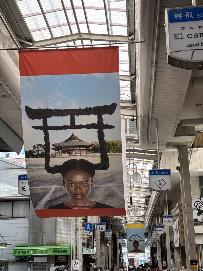 こちらでは、コートジボワールのレティシア・キイというアーティストの作品が展示されています。去年の冬に京都に滞在して制作した日本文化に刺激を受けた写真の数々が、会場であるDELTAというカフェ・ギャラリーの他、こうして商店街にも掲げられていて良い雰囲気。アフリカの女性の髪の美しさと文化的意義を探求する写真の数々は、「え!? 髪の毛がそんな形に!? 」というワンダーに満ちていますよ。