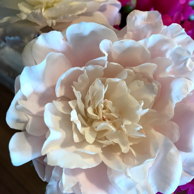 聞けば、シャクヤク。きっと管理が難しいんじゃないかな。こんなにサイズだし、可憐極まりない純白だし。知らんけど。でも、そんな手塩にかけられたご近所さんのシャクヤク、他に赤もセットにしていただきまして、今はうちのリビングに。しばらく楽しませてもらうことにします。