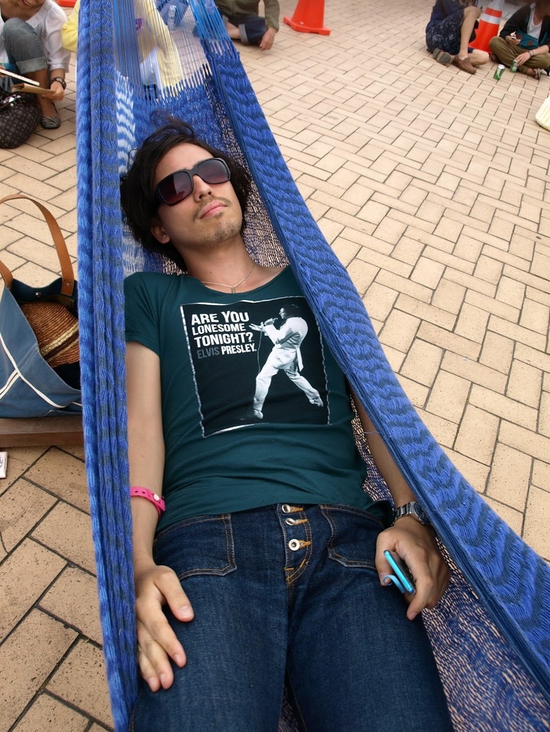 会場にはあちこちにハンモックが置かれていてくつろげるようになっていたんですが、これ、僕、どう見たってくつろいでないですよね。はぁ、京都のマチャオ、ヨコハマ、ヨコスカ、また行きたいよぉ!