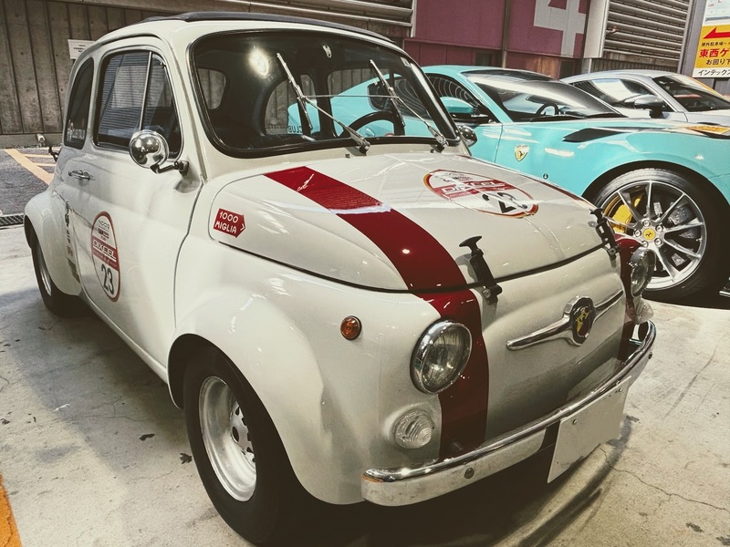 そして、やっぱり写真を撮っちゃうのが、フィアット500(チンクエチェント)のアバルト仕様。ちっこくてかわいい感じなのに、実はレース仕様というギャップがたまらない。とてもきれいに乗っていらっしゃる。しかも、ミッレミリア(1000マイルの意味)のステッカー! 1957年まで行われていた公道レースで、現在はクラシックカーレースとして引き継がれているものじゃないか! たまらんです。