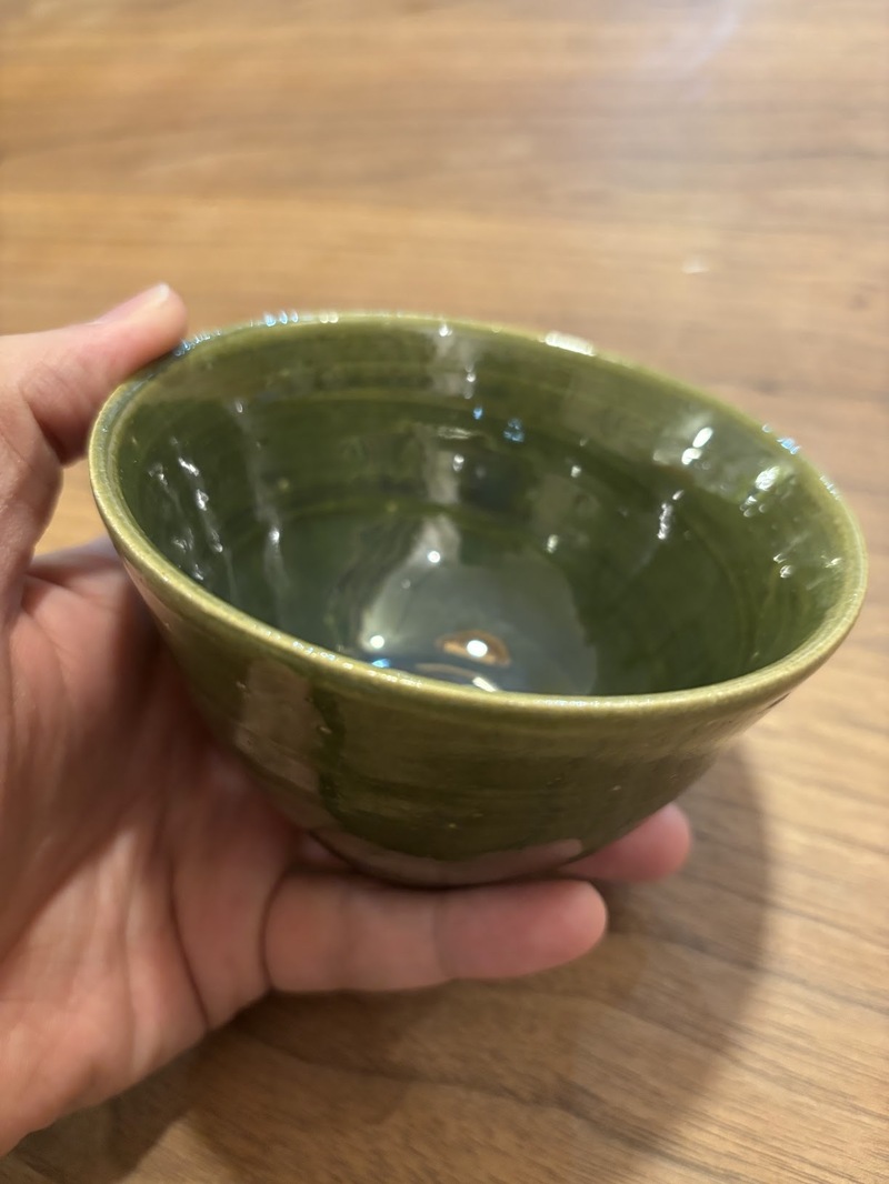 ついつい、いろんな角度から見てしまいます。すると、光の当たり具合によって緑が繊細に変化する様子にまた惚れ惚れ。ただし、この器、重いです。やっぱり、慎重すぎたせいでしょう。とにかく分厚い。自分で作ってみて、職人さんたちの偉大さもよくわかりました。でも、これはこれで最高の思い出の品。大切に使いますよ。分厚くて丈夫だしね!