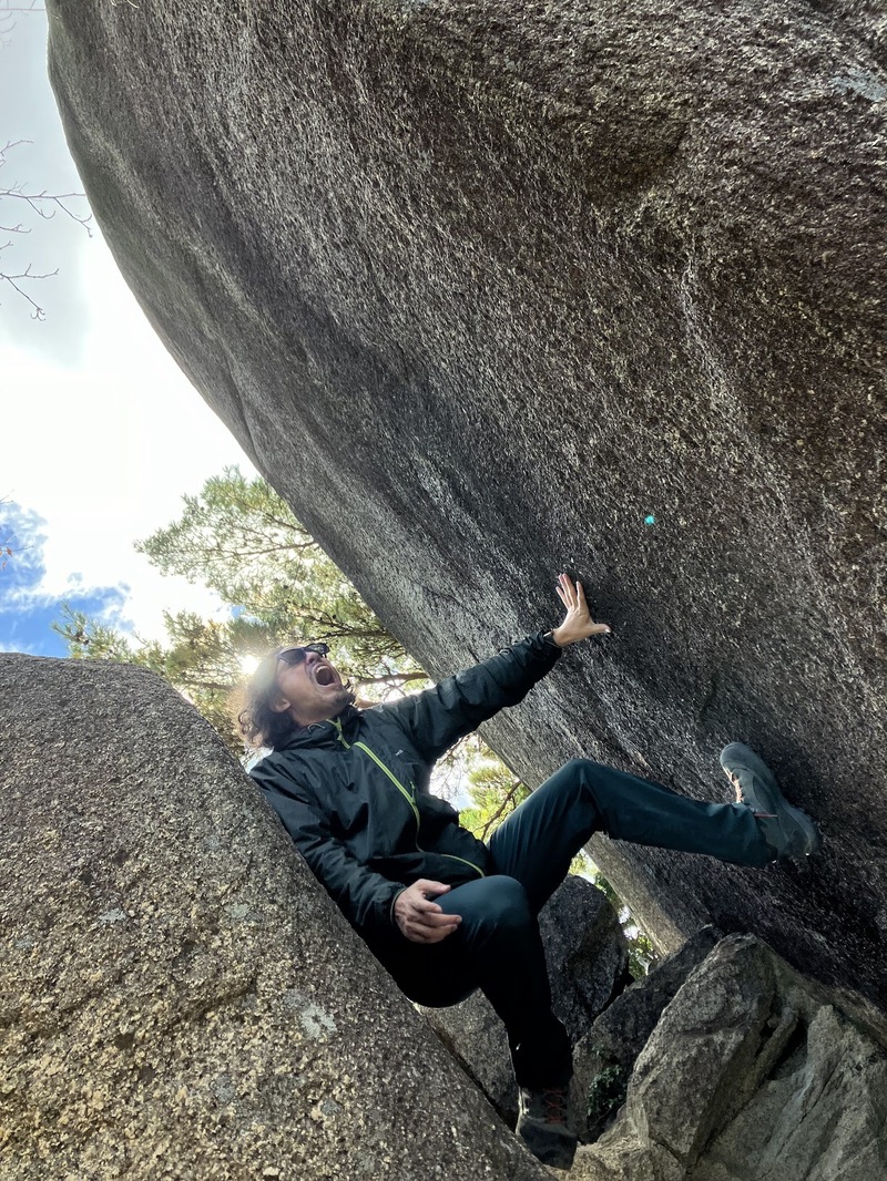 そして、登山の道中も楽しいことは色々ありまして、そのひとつがあちこちにそびえる奇岩の数々です。御在所岳は花崗岩質の山なので、奇抜で巨大な岩がゴロゴロということになるんです。となると、やってしまうんですよね。バランスが悪いと危ないからってことで、僕はすぐにザック(リュック)を下ろし、サッと岩と岩の間に滑り込み、角度を微調整することで、登山者の安全に寄与してきました。ウソです。これが世に言う馬鹿力かしら。