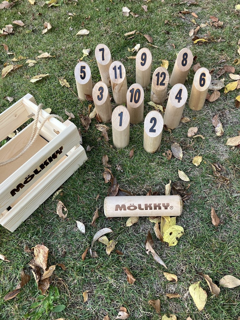 前から思い出した頃に引っ張り出して遊んでいたモルック。これ、ご存知でしょうか? フィンランド発祥の遊びで、ボーリングのピンのように並んだこの番号付きの棒に、数メートル離れたところから別の棒を投げて倒していきます。倒した本数がそのまま点数になる他、もし倒れたのが1本だけなら、その棒に書いてある数字が点数になります。そして誰が最初に50点を取れるかを競うんです。ただし、50ぴったんこでないとダメで、50を1点でも越えてしまうと25点に逆戻りするという非情なルールが… そして、ピンは倒れたり転がったり飛ばされたりしたら、元の位置には戻しません。その場で起こしてゲームを進めるので、この陣形はどんどん崩れていき、ゲームはどんどんおもしろくなるという、よく考えられた遊びです。