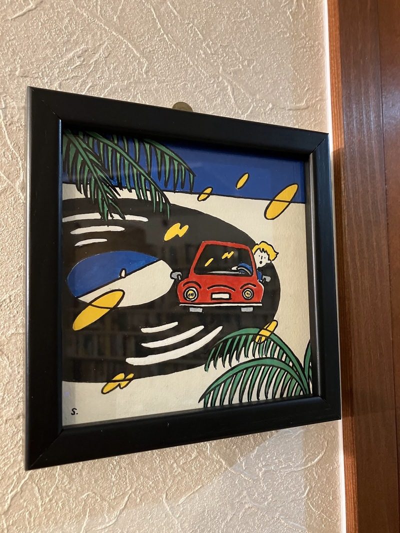 以前ご紹介した、イラストレーターおおえさきさんの個展。気に入った絵がいくつかあって、そのまま販売もされていたので、あれも良いなぁ、これも良いなぁとしばらくウロウロしてから、エイヤッと購入しました。そしたら、店員さんが青くて丸いシールを持ってその絵の下に「売約済み」の印を付けられるわけです。僕にとっては珍しいことだったので、そのシールにまちゃおの「ま」でもマジックで書き足したいくらいでしたが、もちろん堪えました。