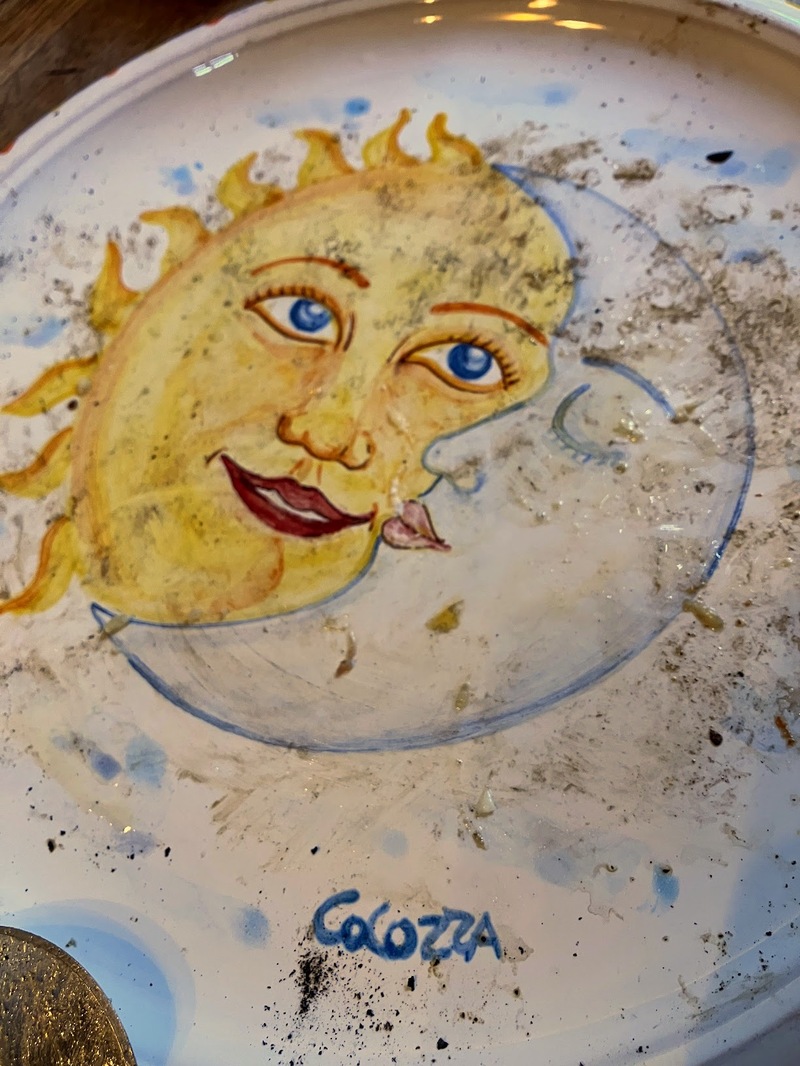 こちらの楽しみは、ピッツァはもちろんなんですが、そのピッツアを食べれば食べるほどあらわになってくるお皿の柄。今回はどんなのだろうって、食べる前からちょっとワクワクしている自分がいるんですよ。イタリアのものでお皿は統一されていて、それぞれにイラストが違うんですね。