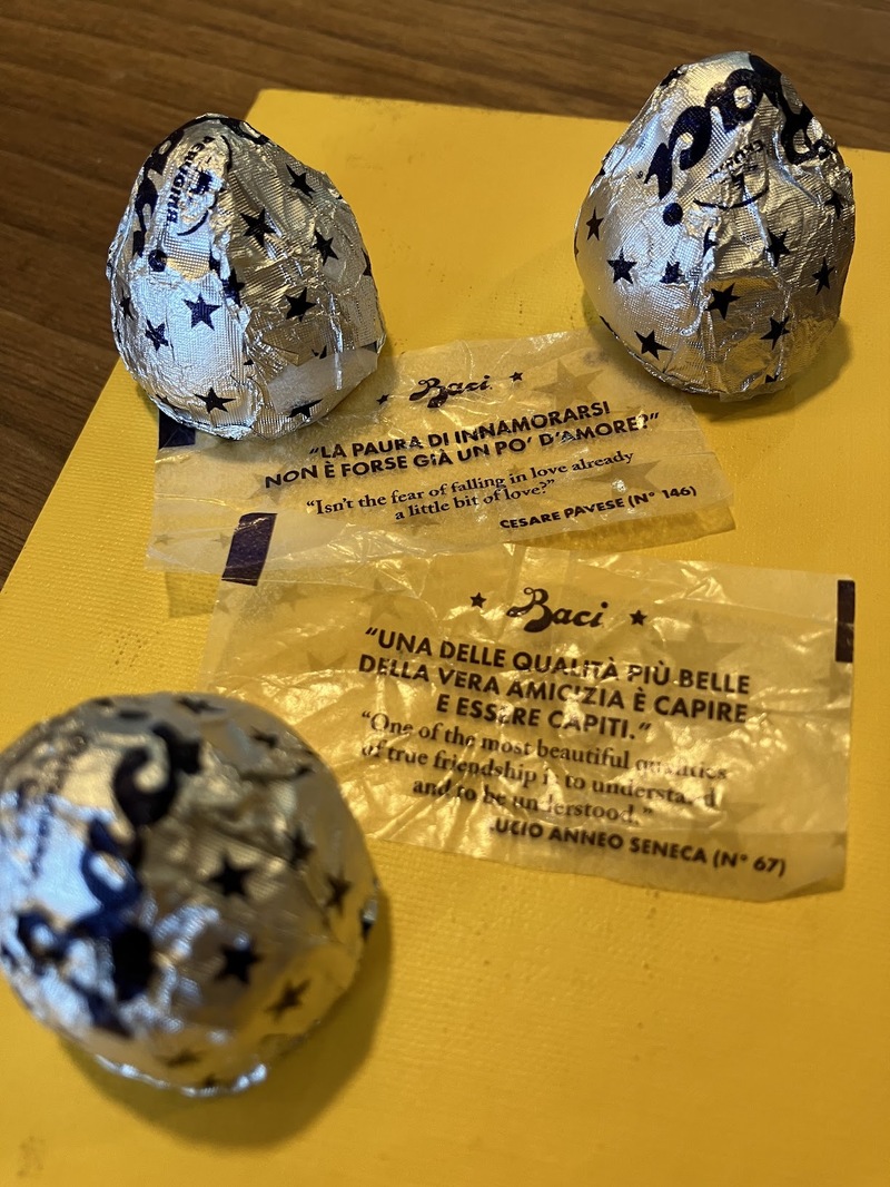 子どもの頃は、何が書いてあるかさっぱりわからずヤキモキし、英語を勉強するようになると英語だけわかるようになり、イタリア語を学ぶようになってからようやく、書かれていることがすべてわかるようになったという長年の付き合いを経ました。でも、食べるのは久しぶり。やっぱり見ちゃいますね。会話の糸口になったり、気に入ったものを何となく残しておいたりしたものだ。そう言えば、古いイタリア映画でチョコを食べながら愛の名言についてカップルが語り合うシーンもあったようなと思い出しました。