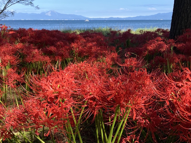 とすると、琵琶湖岸の彼岸花もそろそろ見頃かしら。先週末に向かうと、やはり! 淡い青空。この時期の深い青した琵琶湖。そして、緑の草に真っ赤な彼岸花。見事な景色へと導いてくれた京都の彼岸花にもありがとう。