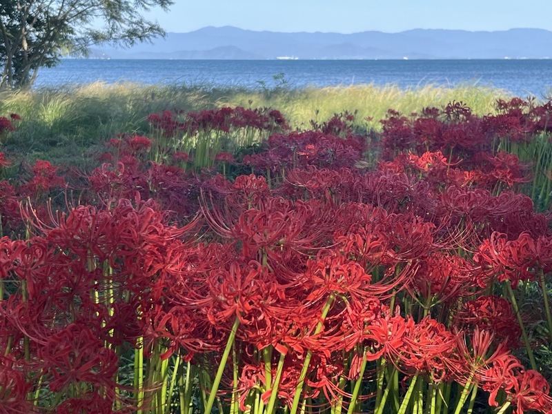 そして、週末です。大阪で彼岸花が咲いているのなら、琵琶湖周辺はもうわんさと咲き誇っているに違いない。そんな経験に基づく予想は見事に的中。松林の下で燃えるように咲いた彼岸花の真紅の絨毯。その向こう側にマザーレイク琵琶湖。遥か向こうには、山々の緑と高い空。今年も見ることができました。これで本格的な秋到来です。夏が長すぎた分、じっくり楽しみたいぜ。