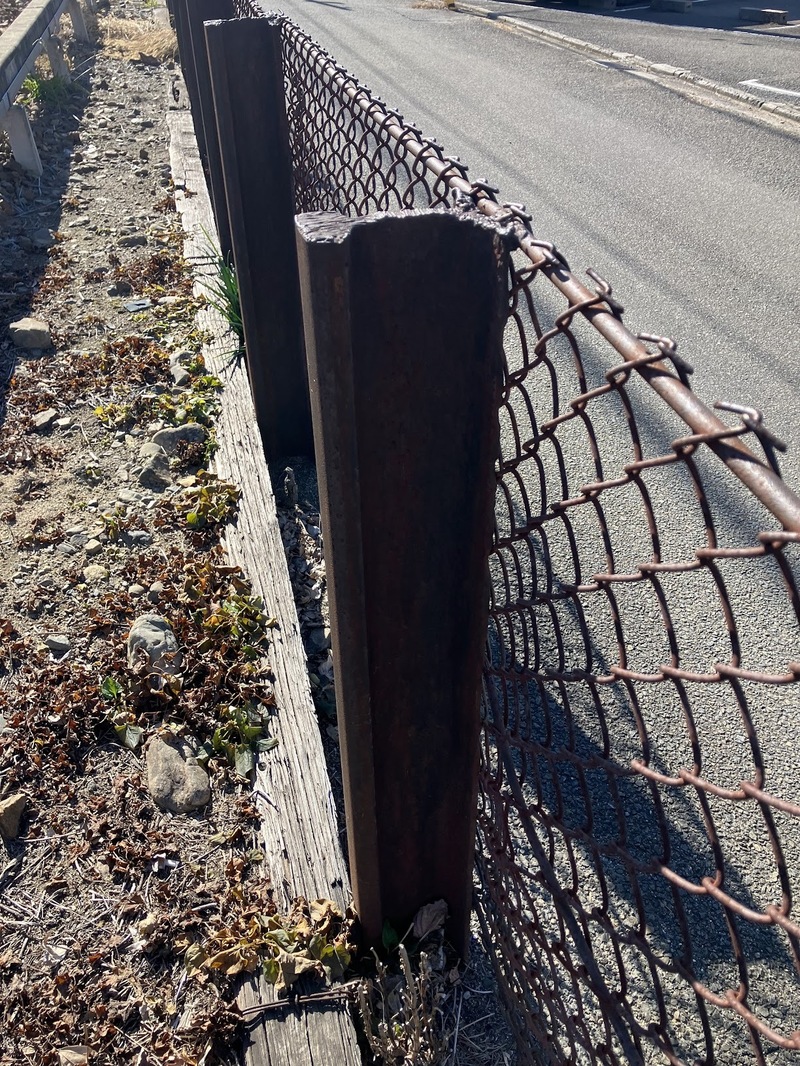 どうやら場所にもよるみたいなんですが、このあたりでは、使わなくなったレールを切断して支柱に活用するというアップサイクルしているようなんです。思わず、走るのを忘れ、切断面などをとくと観察してしまいましたよ。横のものが縦になっていると、気づかないもんだ。レールは敷くものだとばかり思っていましたが、突き刺すこともできると、ここに判明です。