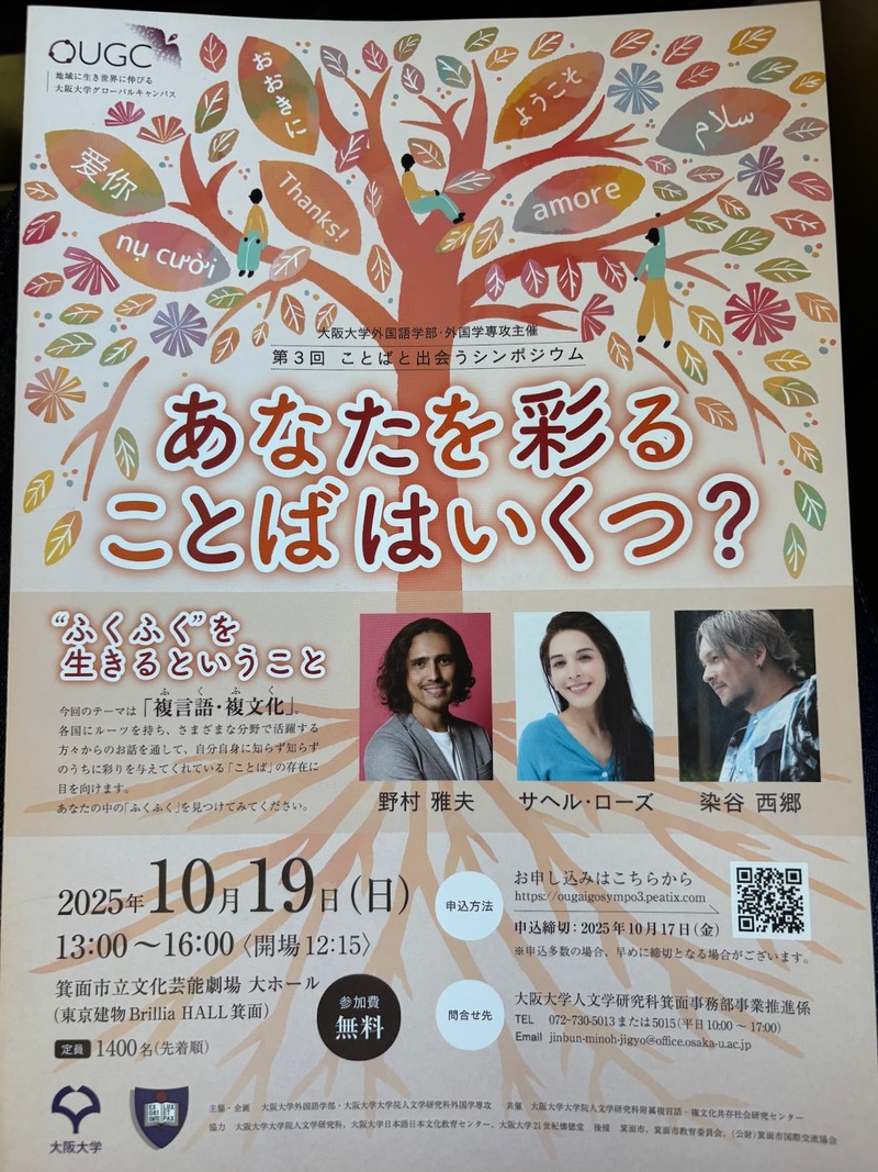 会場は、たいそう立派な箕面市立文化芸能劇場「大」ホールです。1400人も入ります。無料です。「ことばと出会うシンポジウム あなたを彩ることばはいくつ?」。ぜひ、サヘル・ローズさんと染谷西郷くんのためになって心を動かすだろうお話やパフォーマンスを楽しみに、そして生まれたての子鹿のように震えているだろう僕の励ましにお集まりください。