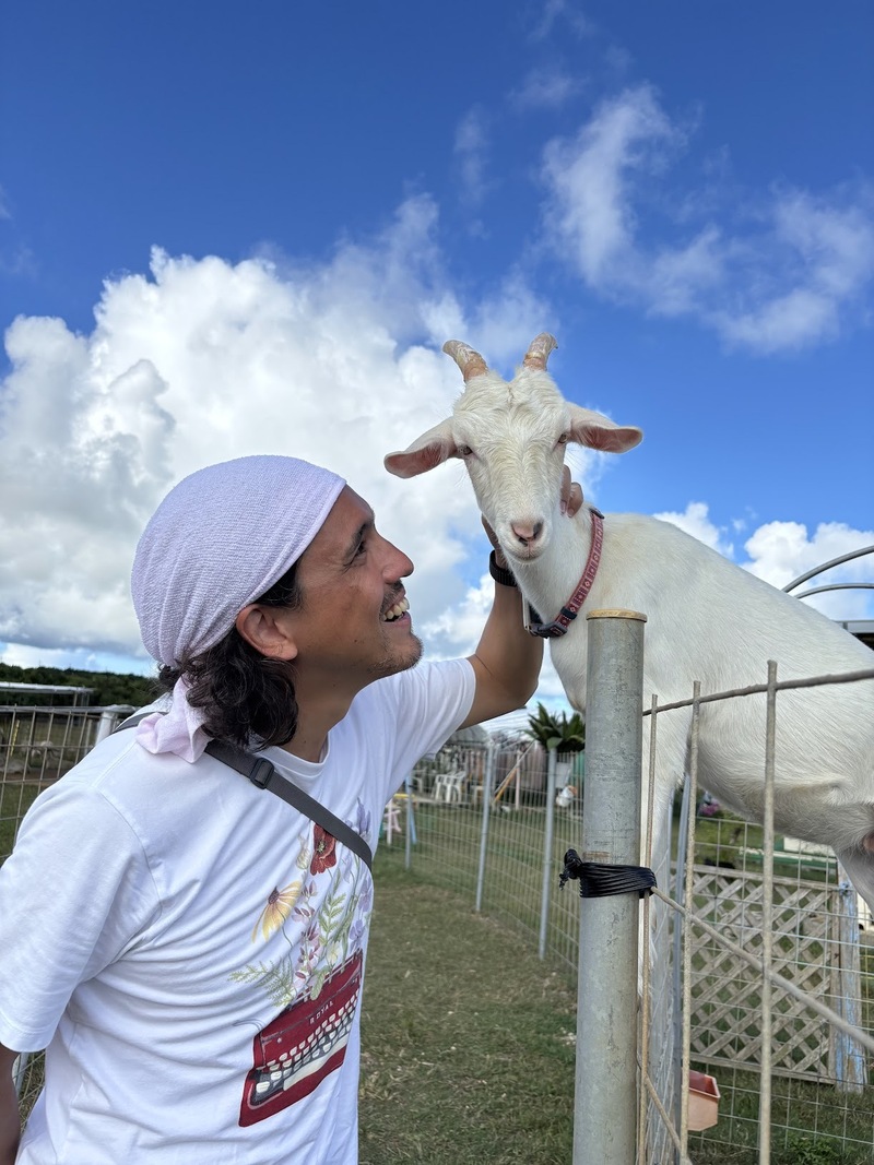 ヤギって、人懐っこいんですよね。たくさんのヤギと触れ合いましたが、僕が一番仲良くなったのが、高いところに飛び乗って柵から身を乗り出してきた、なんとまだ6ヶ月という「しょうこ」ちゃん。大胆なアプローチに、僕もすっかりメロメロになってしまいましたよ。また会いたいな、しょうこちゃん。