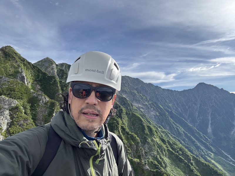 山頂がまた狭いんですよ。はしゃぎ回ると滑落するぞという崖がすぐそこに控えているような中、同じタイミングで登頂を果たした見知らぬ登山者も含めて、互いに写真撮影。山の上って、挨拶も必ずするし、同志って感じがしてくるからなのか、すぐに話をするものなんですよね。一緒に登った仲間との写真も撮りつつ、僕はこわごわとセルフィーでもパチリ。この時の気温は20度を少し切るくらい。涼しかったですよ〜