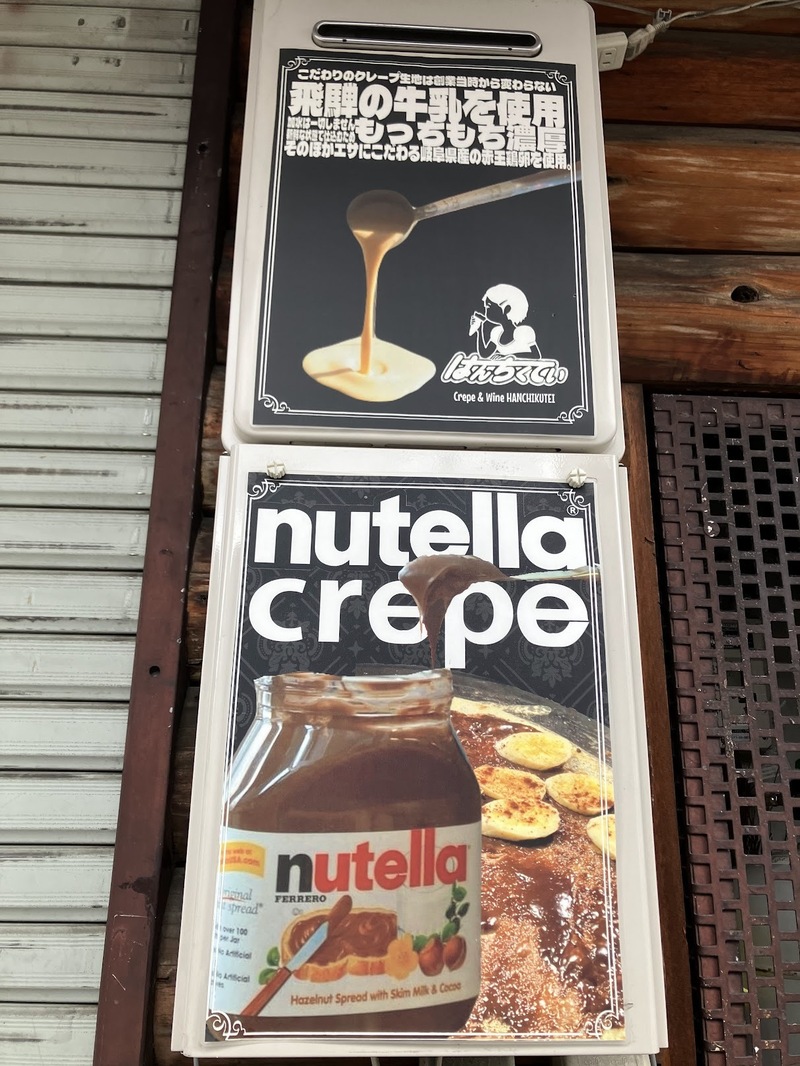 でも、店の脇の小さなメニュー看板を見た僕は、ニヤリ。ヌテラのクレープ、あるやん。こりゃ、たまらん。そして、上の飛騨の牛乳のやつもおいしそう。何より、お店のロゴがまたレトロで良いわぁ。今日は夜も遅いし、閉まっているのは、しょうがない。