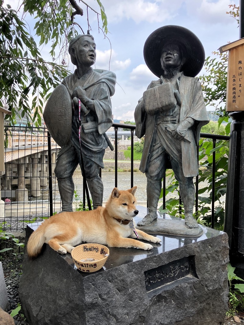 僕が日常的に通る、京都三条大橋。十返舎一九の『東海道中膝栗毛』でおなじみ、弥次さん喜多さんの像があること、ご存知でした? ふたりが清水寺へ詣でた後に、三条大橋付近の宿に宿泊したという描写があることから、旅の道中安全を祈念して建立されたものです。