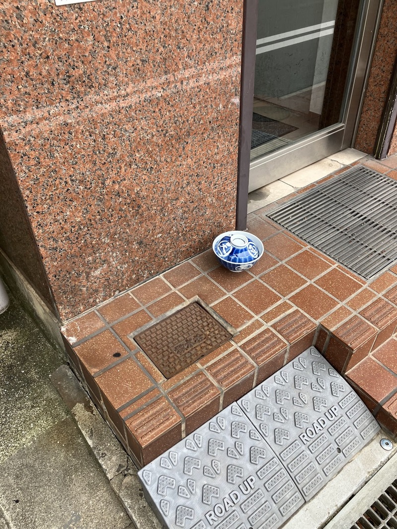 ノスタルジックな光景に出会いました。これ、昔はよく見た気がするんです。ドアの前に、洗った丼鉢。出前を取ったんでしょうね。