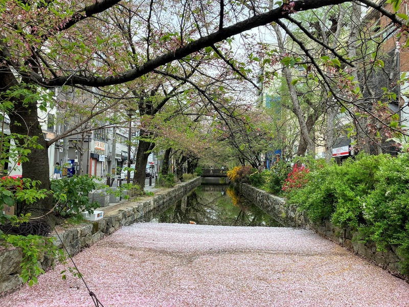 京都の高瀬川です。桜並木が咲き誇ればそれはそれは美しいんですが、一気に散ると、水深のあまりない運河である高瀬川が大変なことになる。そこで、こうやって堰き止めてあるんですね。