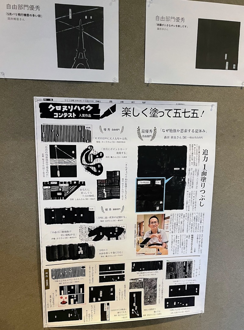 クロヌリハイク? なんじゃらほい。一通り説明書きを読んで、おおよそのところを理解しました。これ、すごいです。地元の愛媛新聞が提唱している知的遊戯とも言えるクロヌリハイクは、紙面に印字された記事から好きな文字を選んで俳句をひねり出すというもの。ピックアップした文字を浮き上がらせるために、その文字以外は黒く塗りつぶすんですが、するとどうでしょう、シンプルに文字を並べるのとは違う造形美と呼びたくなるような文字アートのできあがり。新聞から文字を探すために、紙面もしっかり読むようになるわけですから、新聞のキャンペーンとしても百点満点じゃないでしょうか。
