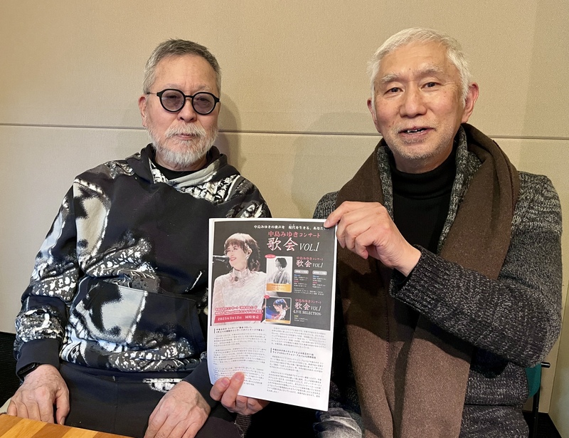 写真は 瀬尾一三さんとアルバム「歌会 VOL.1 -LIVE SELECTION-」のプレスリリースを手にした田家秀樹さん。