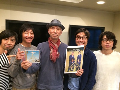 写真は、収録時のウルフルズの4人と番組MC:田家秀樹さん。