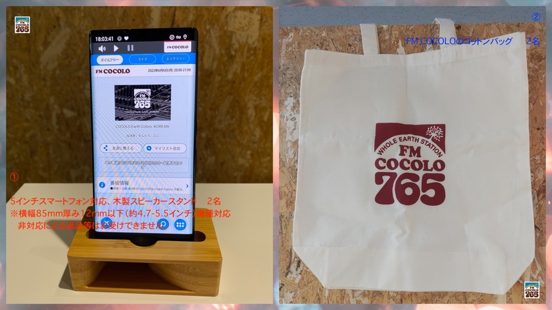 #CEC765 ① 5インチスマートフォン対応、木製スピーカースタンド 2名 スマートフォン各機種に対応する卓上のスタンドです。 スマートフォンのサイズによっては対応できない機種もありますので 詳しいことは番組のHP、ツィッターなどをご覧ください。 ② FM COCOLOのコットンバッグ 2名[6.6 mon]