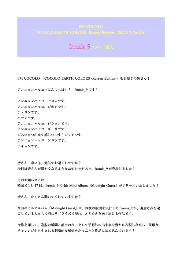 #CEC765 FM COCOLO COCOLO EARTH COLORS -Korean Edition- (2022.2.7 On Air) fromis_9 コメント訳文2[2.7 mon]