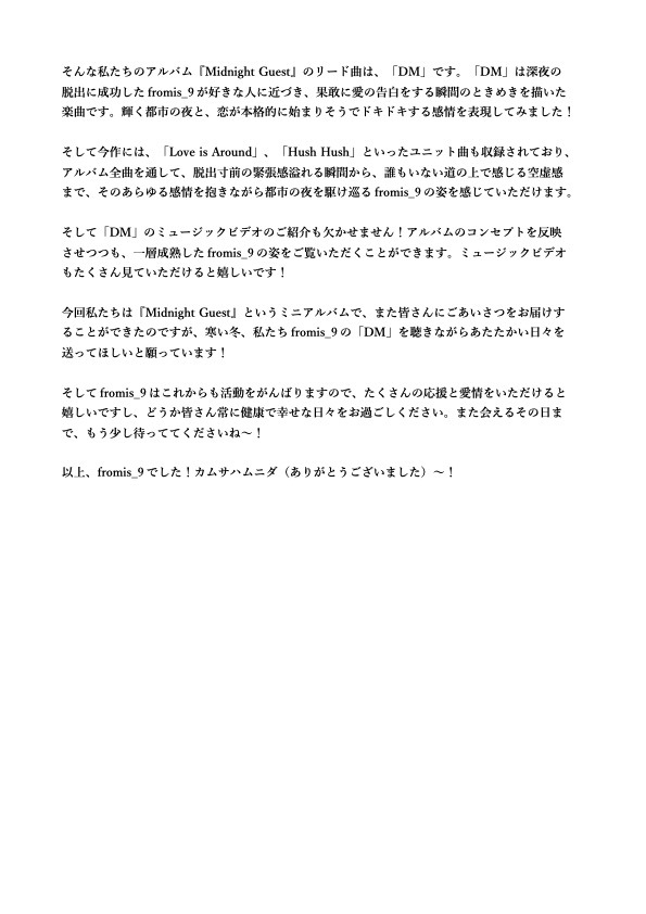 今回私たちは『Midnight Guest』というミニアルバムで、また皆さんにごあいさつをお届けす ることができたのですが、寒い冬、私たち fromis_9 の「DM」を聴きながらあたたかい日々を 送ってほしいと願っています!