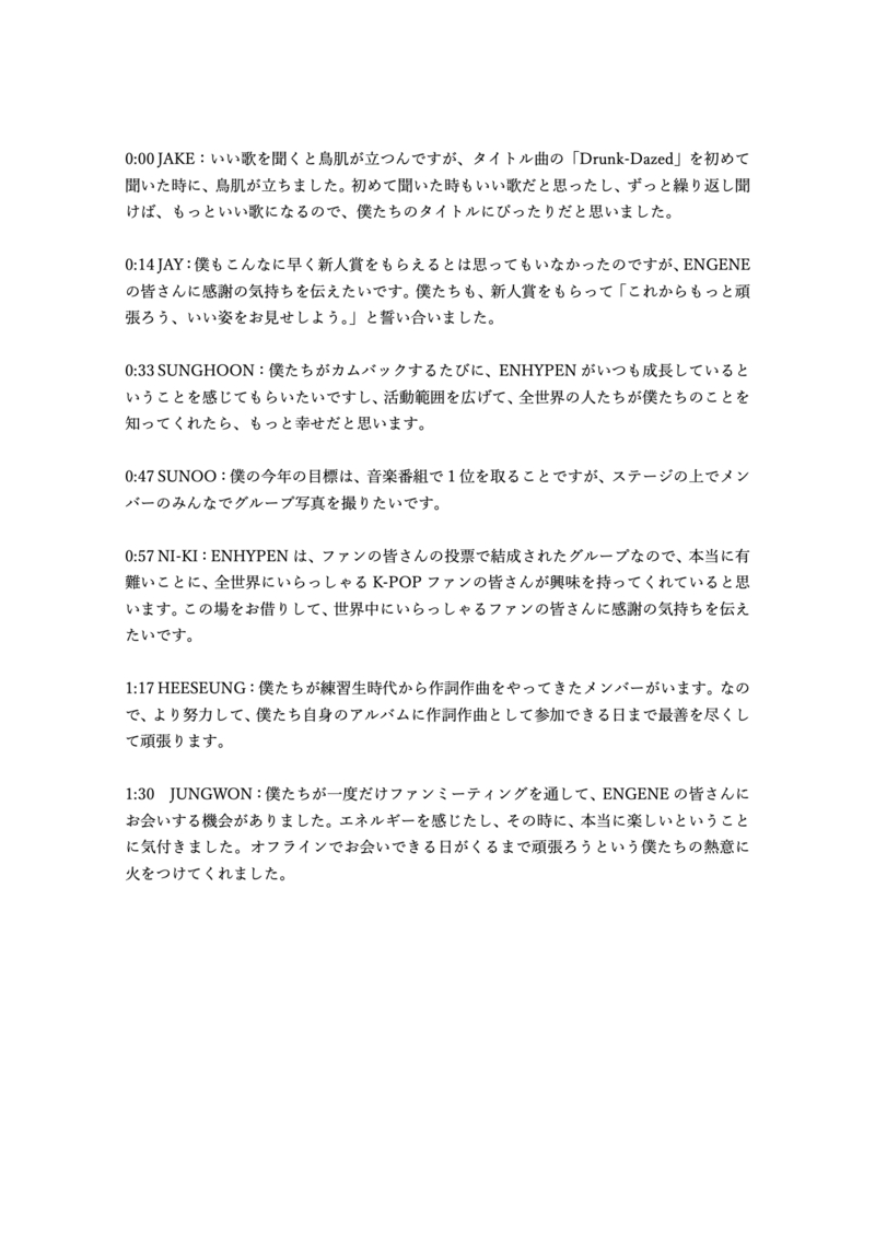 0:33 SUNGHOON:僕たちがカムバックするたびに、ENHYPEN がいつも成⻑していると いうことを感じてもらいたいですし、活動範囲を広げて、全世界の人たちが僕たちのことを 知ってくれたら、もっと幸せだと思います。
